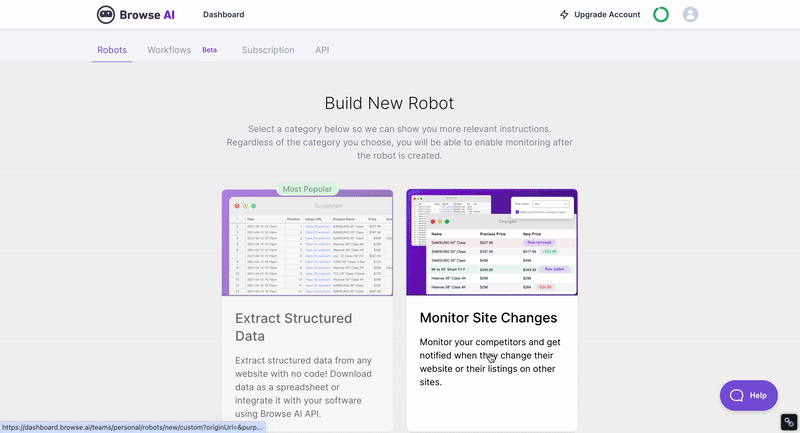 Browse AI 是一款線上免費網路爬蟲程式,提供網頁版及Chrome Extension版本。目前服務提供兩種主要功能「抓取有規律的網站資料」以及「監控網站頁面變化」,換句話說,主要針對「單一網址」的資料抓取。